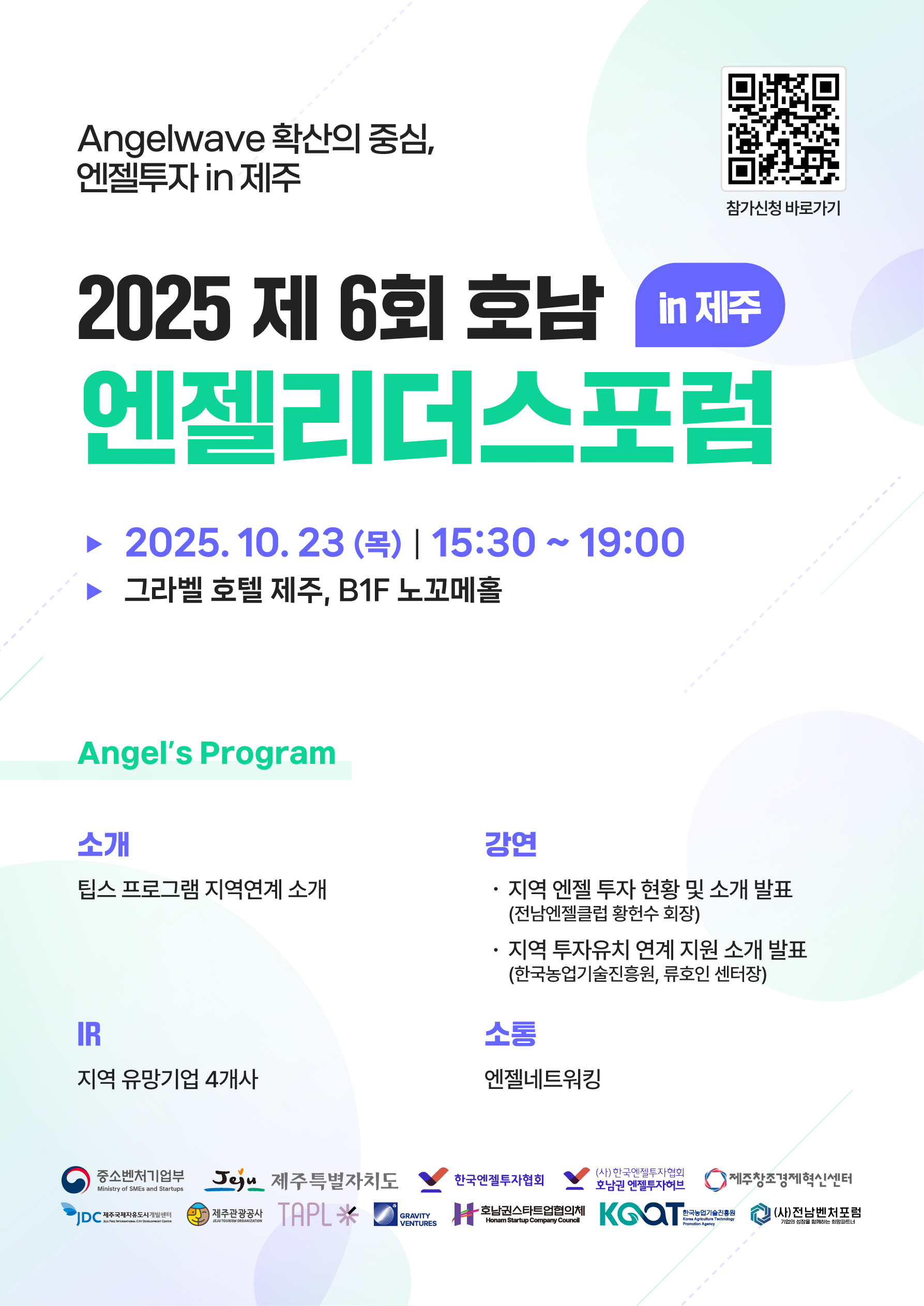 10월 23일(목)에 진행하는 '2025-6회 호남 엔젤리더스포럼 in 제주' 행사 안내드립니다.